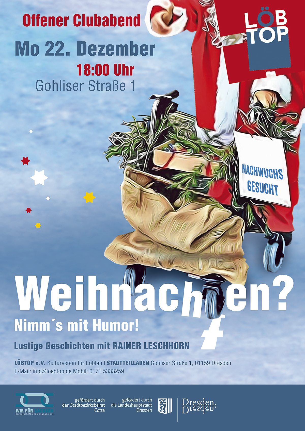 18:00 Uhr | Weihnachten? Nimm´s mit Humor. Ein Clubabend mit Rainer Leschhorn. Herzliche Einladung in den Stadtteilladen.