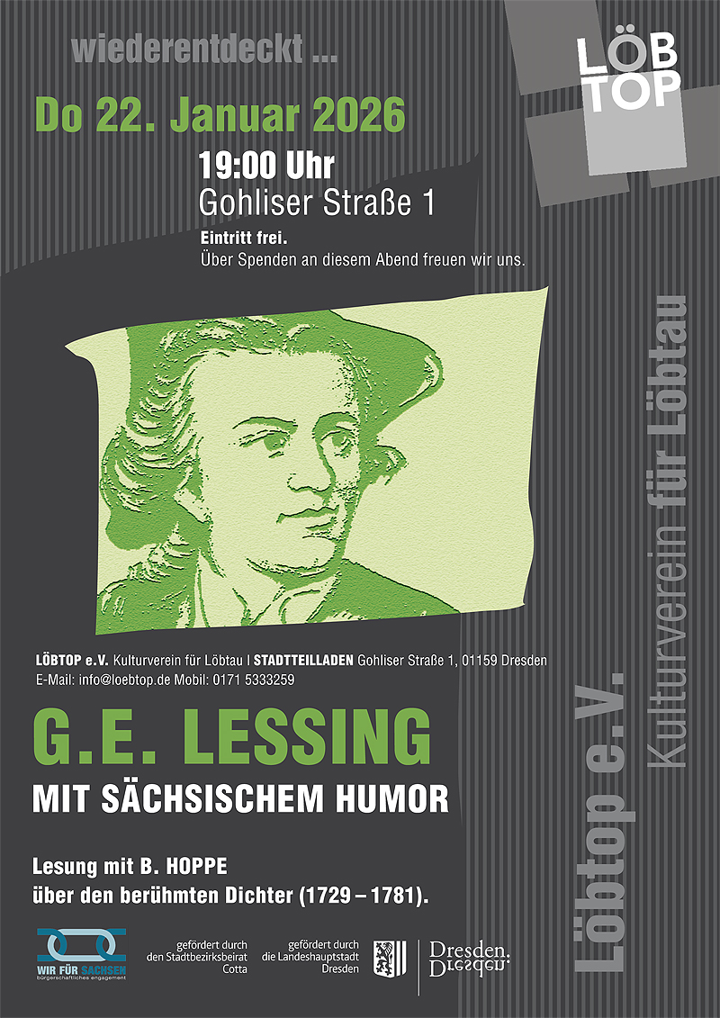 19:00 Uhr | Gotthold Ephraim Lessing. Mit sächsischem Humor. Offener Clubabend über den berühmten Dichter (1729-1781) mit Brigitte Hoppe. Herzliche Einladung in den Stadtteilladen.