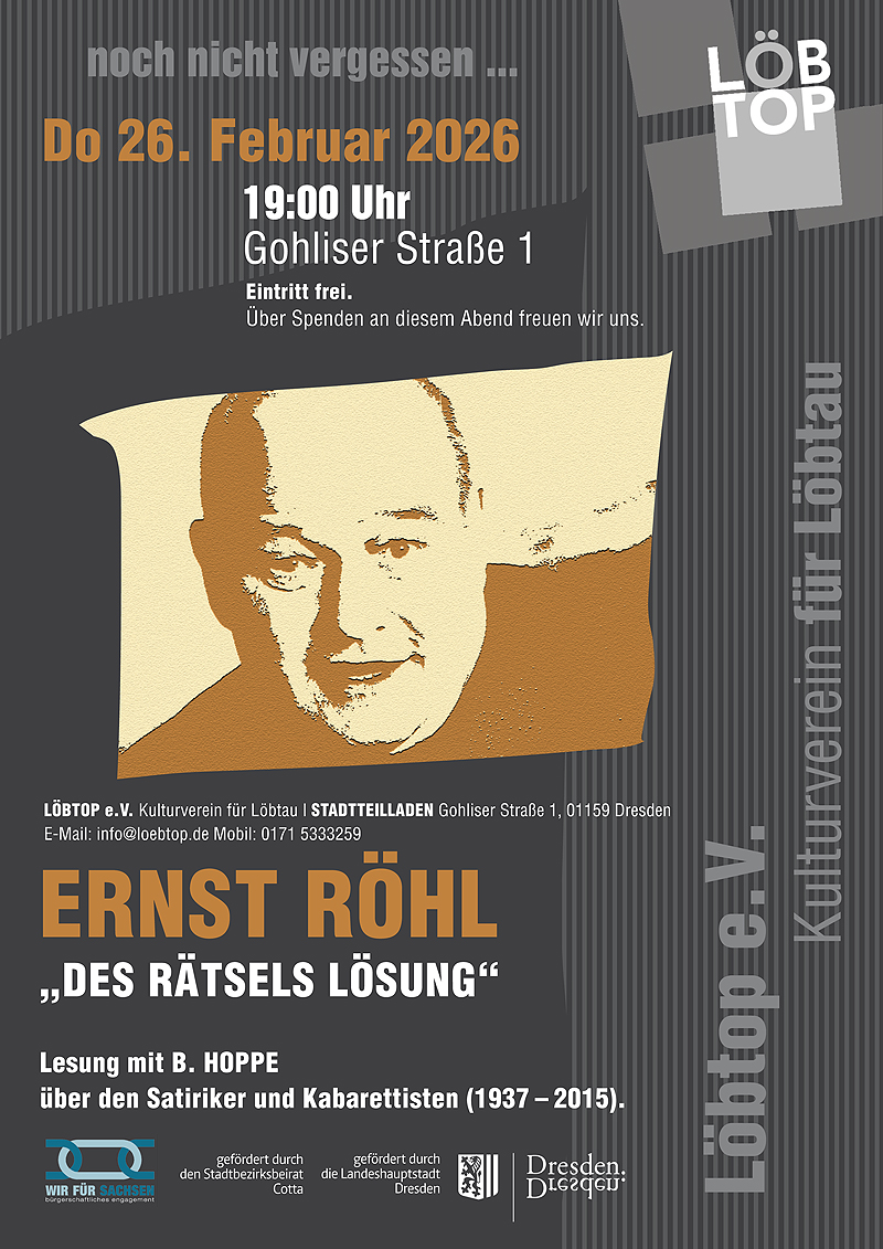 19:00 Uhr | “Des Rätsels Lösung” über den Satiriker und Kabarettisten Ernst Röhrl. Mit Brigitte Hoppe. Herzliche Einladung in den Stadtteilladen.