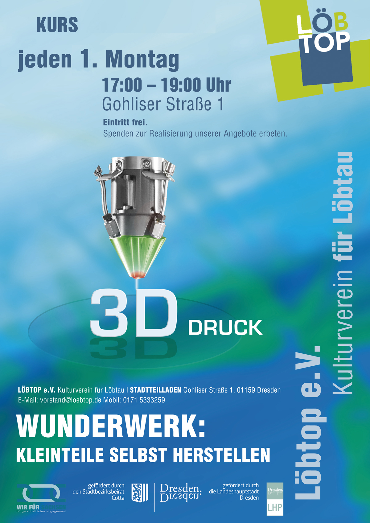 Mit 3D-Druck naht unter kundiger Hand eventuell Rettung. Neu konstruiert am PC oder das defekte Teil ausgemessen und mittels Software nachgebaut – den Rest erledigt eine kleine Düse, die das 300 Grad heiße Material in Form spritzt. All das direkt nun auch bei uns im Stadtteilladen. Zwei Termine haben wir als Test geplant. Maschine, Computer, Material und Kenntnis bringt der Fachmann mit.